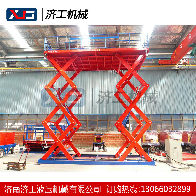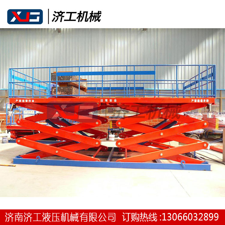 固定剪叉式升降機貨梯主要用于建筑物層間貨物上下運送,安裝在地坑內,下降低時工作臺面與地面相平。